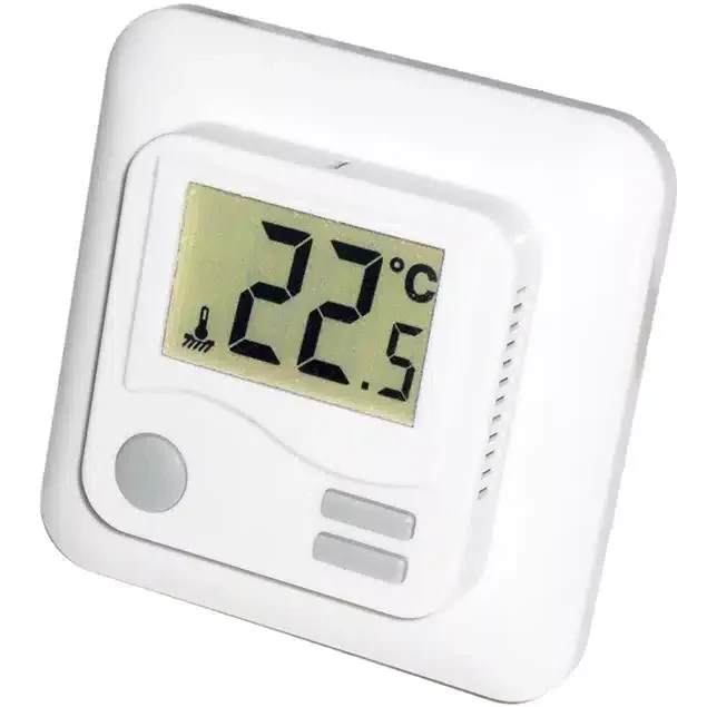 Stor LCD-display. Två knappar för inställning av temperatur och en till / frånbrytare gör denna termostat enkel att använda.