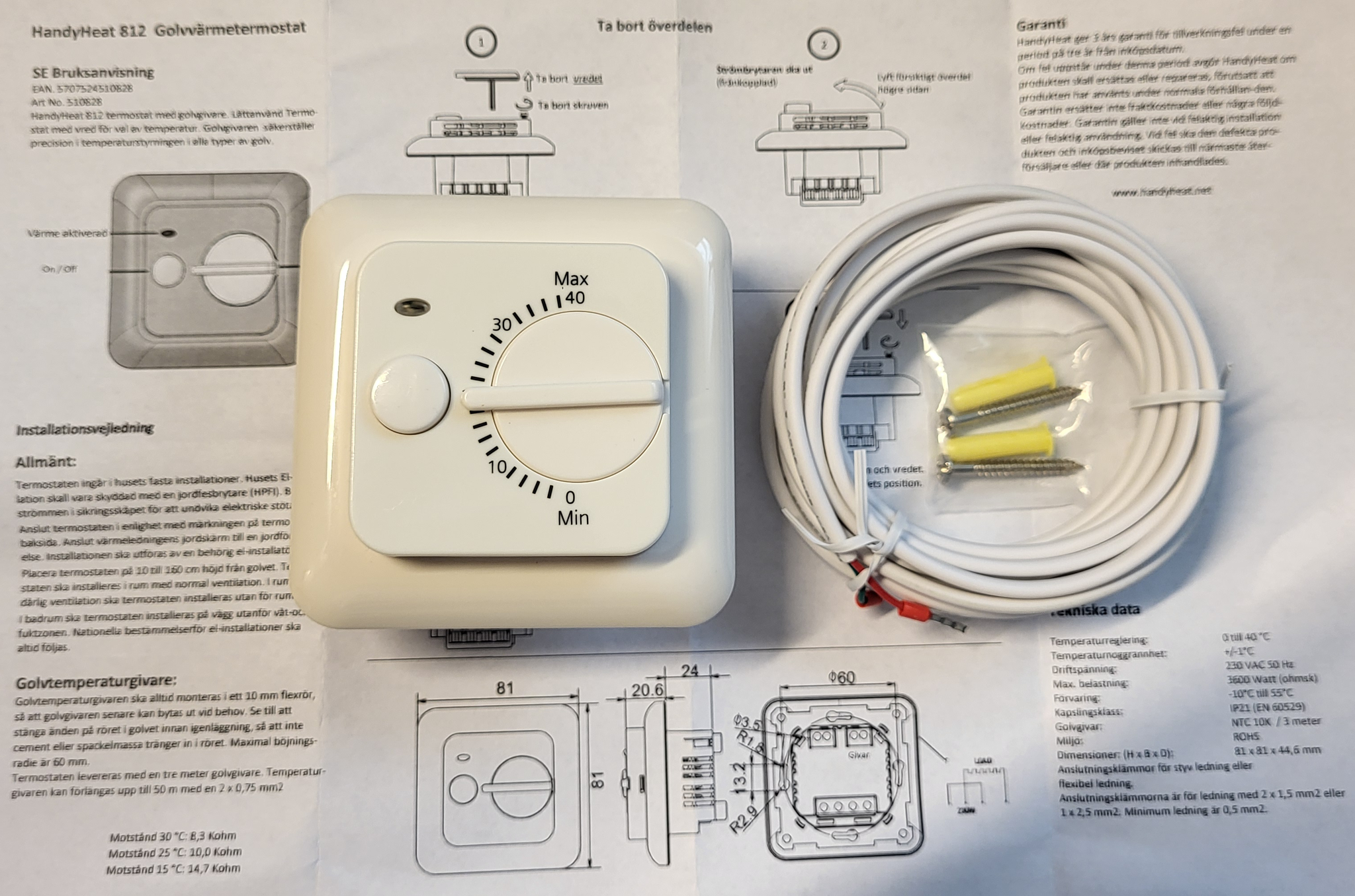 Klicka på produktbilden och läs om hur den manuella termostaten fungerar. Den har 3 års garanti mot produktfel. Om det åskar mycket eller att Ni tycker det är krångligt att programmera så är den här mycket lätt att jobba med.